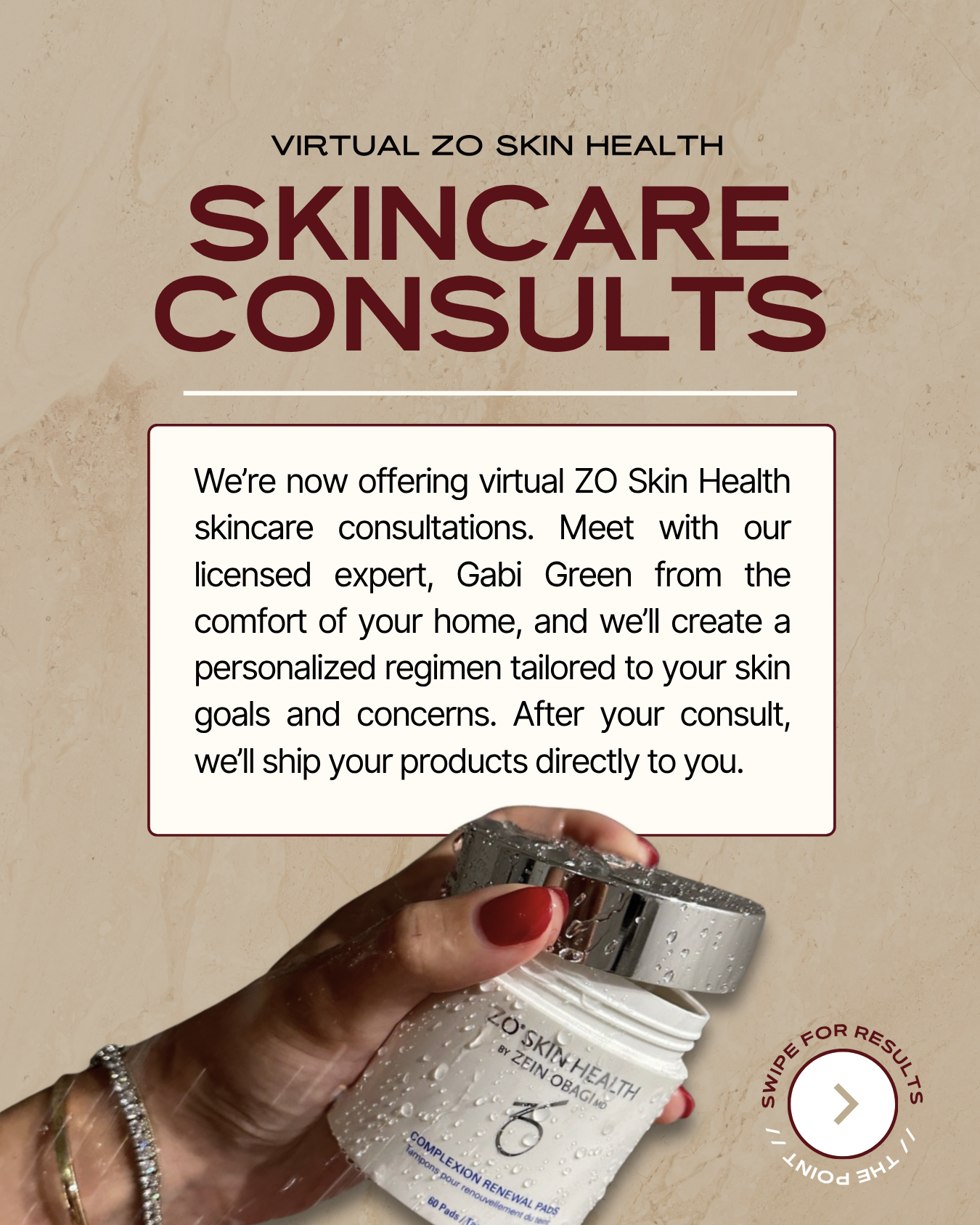 We’re now offering virtual ZO Skin Health skincare consultations. Meet one-on-one with our licensed expert, Gabi Green, from the comfort of your home. Together, we’ll create a personalized skincare regimen tailored to your unique skin goals and concerns. After your consultation, your custom ZO Skin Health products will be shipped directly to your door. Enter your info below to get a free consultation with us!